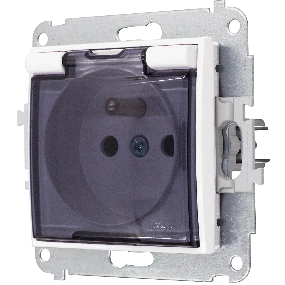 - 1 szt. Karlik Seria Mini Mechanizm gniazda bryzgoszczelnego z uziemieniem 2P+Z (klapka dymna, przesłony torów prądowych) kolor biały mat symbol 25MGPB-1zdp