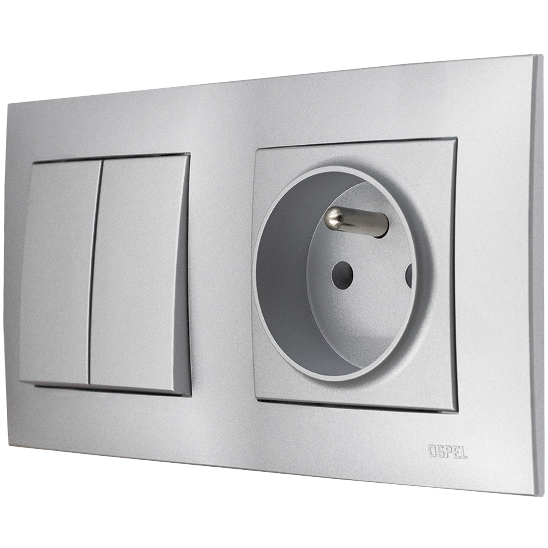 Ospel Szafir Srebrny Włącznik / Łącznik Podwójny Z Gniazdem Pojedynczym Zestaw Z Ramką