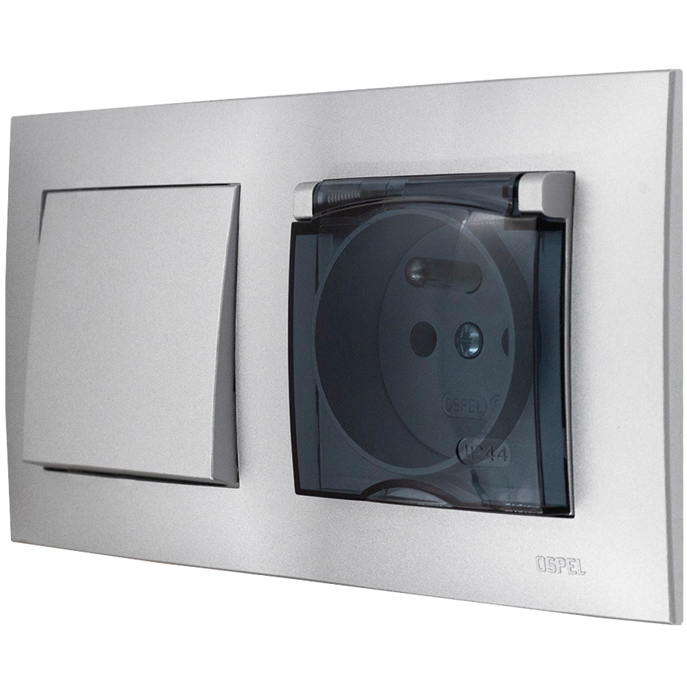 Opis Produktu: Ospel Szafir Srebrny Włącznik / łącznik pojedynczy i gniazdo / gniazdko hermetyczne zestaw z ramką