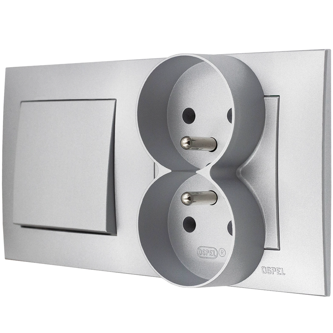 Ospel Szafir Srebrny Włącznik / Łącznik pojedynczy z gniazdem podwójnym zestaw z ramką
