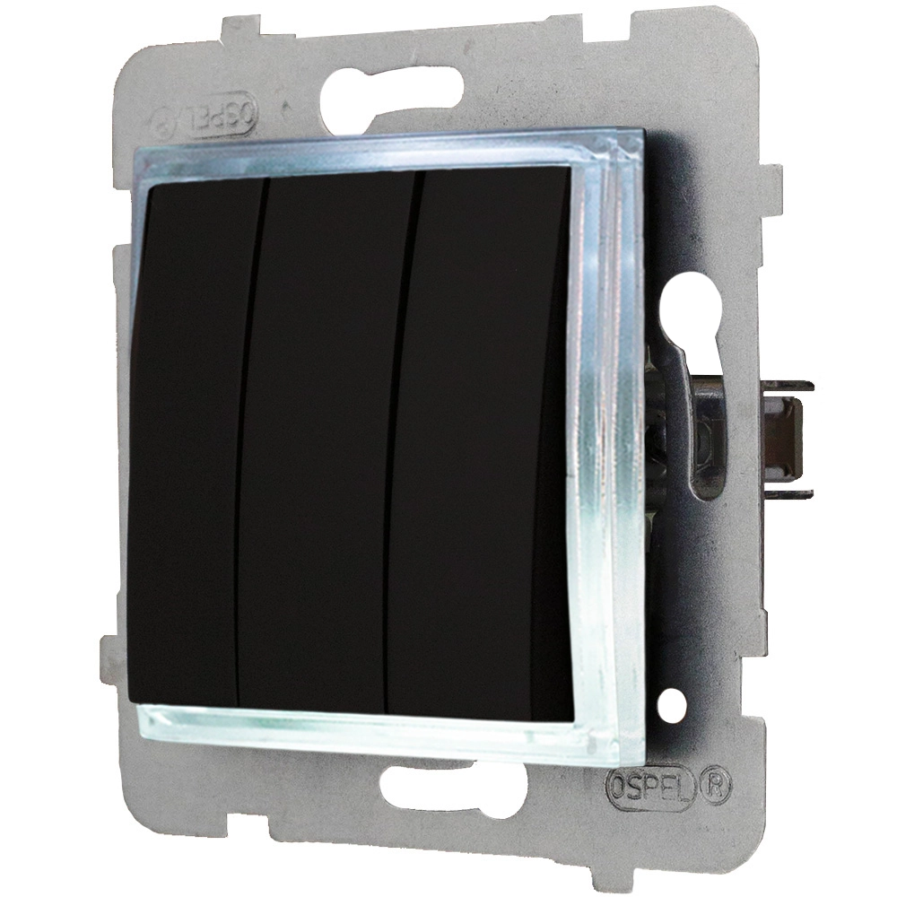 Zestaw składający się z włącznika potrójnego bez ramki oraz zestawu podświetlenia led. Włącznik montowany podtynkowo w standardowych puszkach fi60. Do włącznika należy doprać ramkę zewnętrzną.