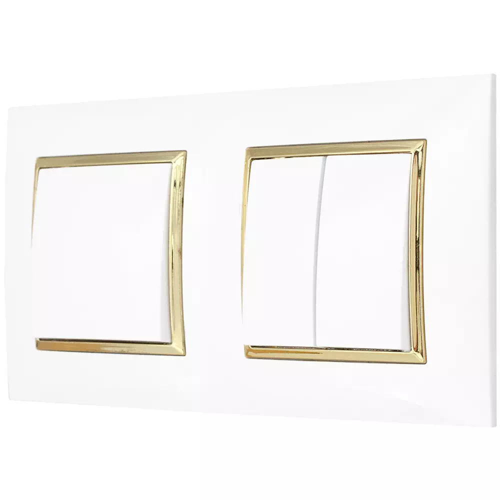 ZESTAW DWÓCH WŁĄCZNIKÓW POJEDYNCZY I PODWÓJNY ARIA W KOLOŻE BIAŁYM Z RAMKĄ PODWÓJNĄ I OBRAMÓWKĄ ZŁOTĄ. MONTOWANE W STANDARDOWYCH PUSZKACH FI60 ŁĄCZONYCH.