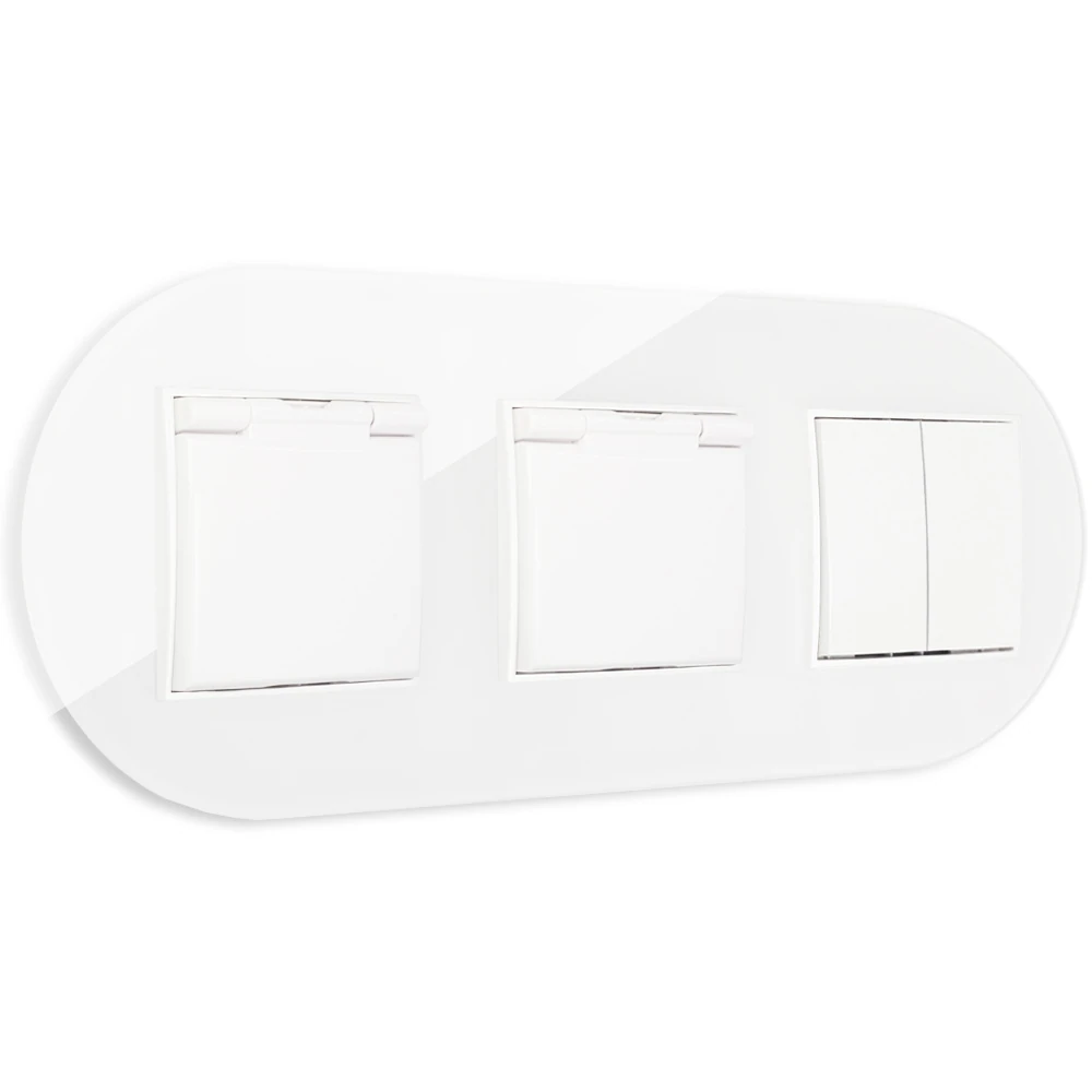 Włącznik podwójny i dwa gniazda hermetyczne z ramką okrągłą efekt szkła seria ICON kolor biały