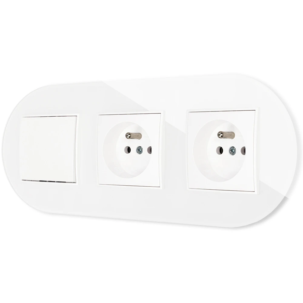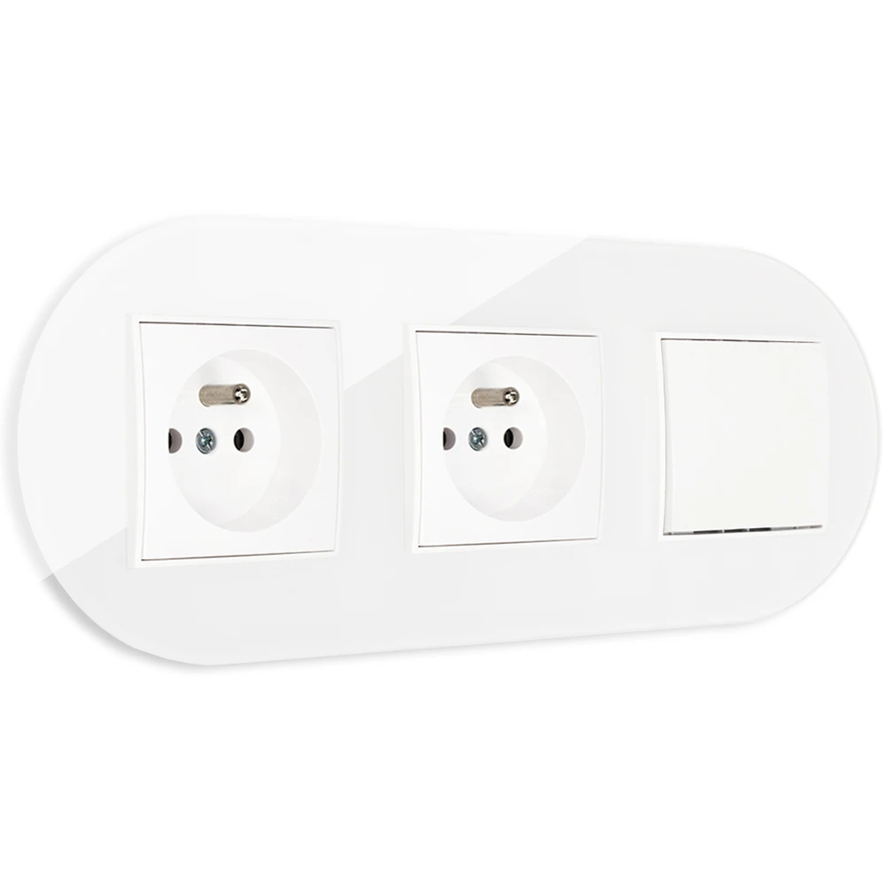 Włącznik pojedynczy i dwa gniazda pojedyncze z ramką okrągłą efekt szkła seria ICON kolor biały