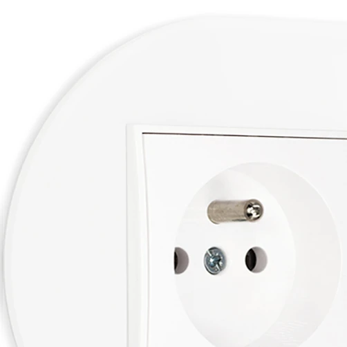Zestaw produktów o kodzie 58954436 Włącznik pojedynczy i dwa gniazda pojedyncze z ramką okrągłą efekt szkła seria ICON kolor biały składający się z następujących produktów: